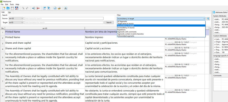 • Bilingual ExcelA excepción de los últimos tres, que son más bien archivos de origen y de soporte, los programas que pueden reconocer uno o varios de estos formatos son SDL Trados Studio, memoQ, Wordfast, Phrase (antes Memsource) u OmegaT.Las herramientas especializadas a través de las cuales construyo las MT y BT o llevo a cabo el LQA son SDLXliff2Tmx, Glossary Converter, Golden Editor, XBench, Heartsome, TMX Editor, OmegaT Aligner, Trados Studio Aligner o MultiTerm.El control de calidad garantiza que no haya repeticiones, etiquetas (tags) innecesarias generadas automáticamente, inconsistencia entre el destino y el origen, faltas de correspondencia numérica o de etiquetas, desajustes como consecuencia de la alineación o espacios dobles. Aunque suelen aparecer falsos positivos, es la mejor manera de mantener el estándar al 100 % de calidad y de cosechar bases de datos limpias.Para más información, pide tu presupuesto sin compromiso o escribe a las direcciones indicadas abajo. Más servicios aquí.